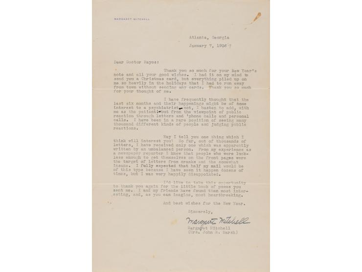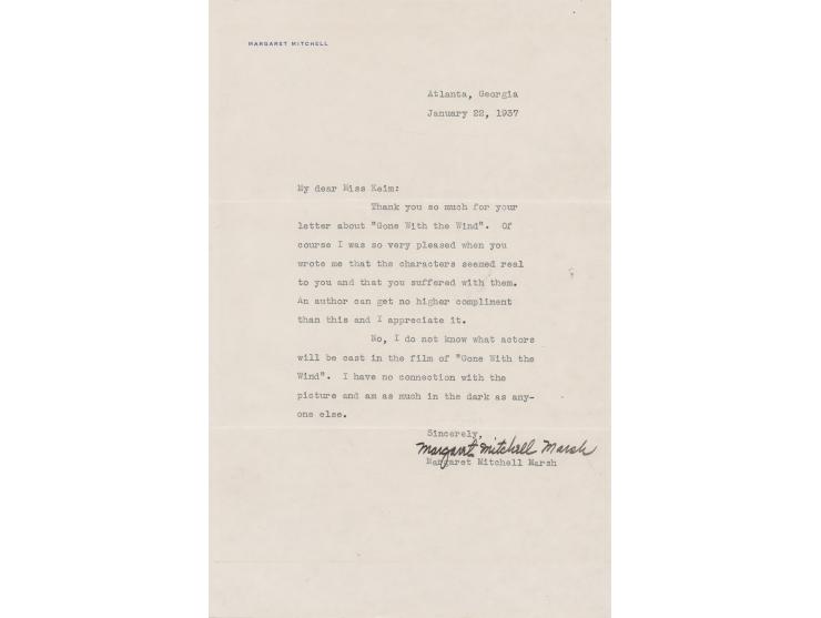 TLS signed "Margaret Mitchell Marsh," one page, 7 x 11, personal letterhead, January 22, 1937. Letter to "Miss Keim," in full: "Thank you so much for your letter about 'Gone with the Wind.' Of course I was so very pleased when you wrote me that the characters seemed real to you and that you suffered with them. An author can get no higher compliment than this and I appreciate it. No, I do not know what actors will be cast in the film of 'Gone with the Wind.' I have no connection with the picture and am as much in the dark as anyone else." In fine condition.