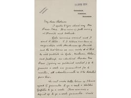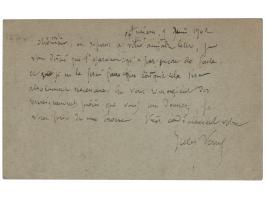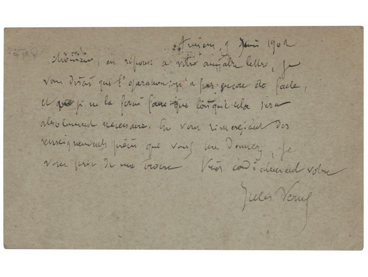 ALS in French, signed "Jules Verne," one page on a 5.5 x 3.5 postcard, June 9, 1902. Handwritten letter to a friend, sending thanks for his message and commenting on a needed surgery. Addressed on the reverse in Verne's hand. In fine condition, with some paper residue along the left edge of the address side.