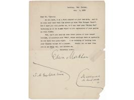 - TLS signed "Edwin Markham," one page, October 5, 1909, to George Sylvester Viereck. In part: "As you know, I am a warm admirer of your best work; and it is only your best work that should go into 'The Younger Choir.' Now I know you will pardon me, if I say that your 'Golden Boy' (pleasing as it is in some ways) is not expressive of your genius at full flower. Now, can't you send me some other pieces of your verse? Include, if possible, your 'Owl,' whose hootings were so agreeable to our ears that gala night." Viereck's poems 'Ode to a Parrot' and 'Iron Passion' would ultimately appear in the anthology.
