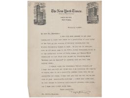 - TLS signed "Joyce Kilmer," one page, New York Times letterhead, February 5, 1916, to "Dr. Skrainka." In part: "If you are in town, you must by all means come to the Fifth Avenue Restaurant…and eat and drink with us, and say something about 'Dickens and the Doctors' or anything else you feel like talking about. I always enjoy the Interstate Medical Journal, and I hope that you will not think that I am lessening its dignity in saying that it is a scientific journal which even the unscientific can enjoy."