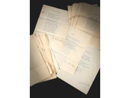 Collection of 26 typewritten manuscripts of poems by renowned lyrical poet and playwright Edna St. Vincent Millay, 28 total pages on 8.5 x 11 sheets, compiled by her mother, Cora Lounella Buzelle, and forwarded to Charles Hapgood, the son of writers Hutchins Hapgood and Neith Boyce, on September 24, 1920. Of the collection, three of the poems are signed at the bottom in fountain pen by the author, “Edna St. Vincent Millay.” These are: ‘Burial,’ ‘Doubt No More That Oberon’ [both published in 1920], and ‘The Wood Road’ [published in 1923]. The full list of unsigned poems includes: