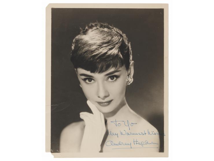 Gorgeous vintage matte-finish 8 x 10 publicity photo of Audrey Hepburn for the 1954 film Sabrina, signed and inscribed in fountain pen, "To Jo, My warmest wishes, Audrey Hepburn.” In very good to fine condition, with a crease and associated short tear to the left edge, loss to two corners that could be matted out if desired.