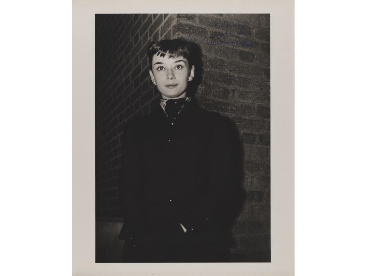 Outstanding oversized vintage semi-glossy 16 x 20 photo of Hepburn taken by Sid Avery near the Fulton Theatre in Manhattan after staging the play Gigi, signed and inscribed in fountain pen "To Manchete, Best Wishes, Audrey Hepburn.” Also signed on the reverse in pencil by photographer Sid Avery, below his "Sid Avery & Associates" credit stamp. In fine condition.