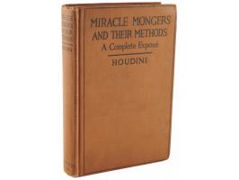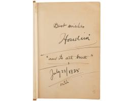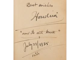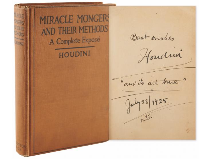 Signed book: Miracle Mongers and Their Methods: A Complete Expose of the Modus Operandi of Fire Eaters, Heat Resisters, Poison Eaters, Venomous Reptile Defiers, Sword Swallowers, Human Ostriches, Strong Men, Etc. First edition. NY: E. P. Dutton & Company, 1920. Hardcover, 5.5 x 8.25, 240 pages. Signed nicely on the first free end page in black ink, “Best wishes, Houdini, ‘and it’s all true,’ July 28/1925.” Autographic condition: fine, with a bit of light soiling. Book condition: VG-/None, with bumped corners.