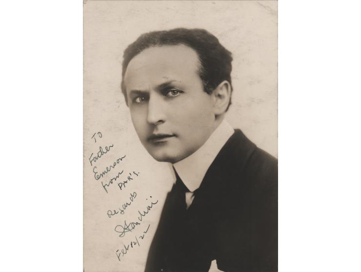 Classic vintage matte-finish 5 x 7 head-and-shoulders photo of the legendary escape artist and illusionist, signed and inscribed in fountain pen, "To Father Emerson from Paris, Regards, Houdini, Feb. 12/22." In fine condition, with a hint of faint silvering and soiling.