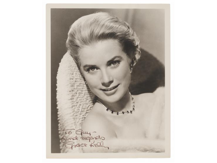 Beautiful vintage matte-finish 8 x 10 head-and-shoulders photo of Kelly clad in furs and jewels, signed and inscribed in fountain pen, "To Guy—fond regards, Grace Kelly.” Reverse bears the stamp of the "Official Grace Kelly Fan Club." In very fine condition.