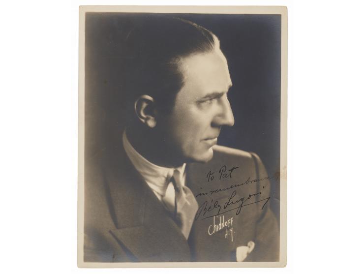 Dramatic vintage matte-finish 8 x 10 photo of Lugosi in profile by NYC photographer Irving Chidnoff, neatly signed and inscribed in fountain pen, "To Pat, in remembrance, Bela Lugosi.” In fine condition.