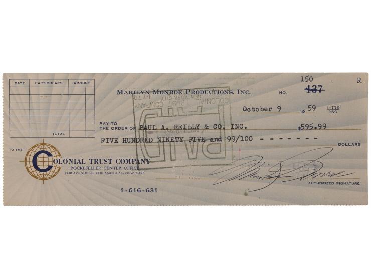 Marilyn Monroe Productions business check (Colonial Trust Company of New York), 8.5 x 3, numbered “150,” filled out in type and signed beautifully by Monroe, "Marilyn Monroe," payable to Paul A. Reilly & Co., Inc., for $595.99, October 9, 1959. In fine condition. At the time she wrote this check, Marilyn was between projects—filming had wrapped on the screwball comedy Some Like It Hot, which would be released the next month on March 29th, and she would begin shooting Let's Make Love in early 1960.