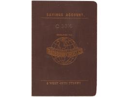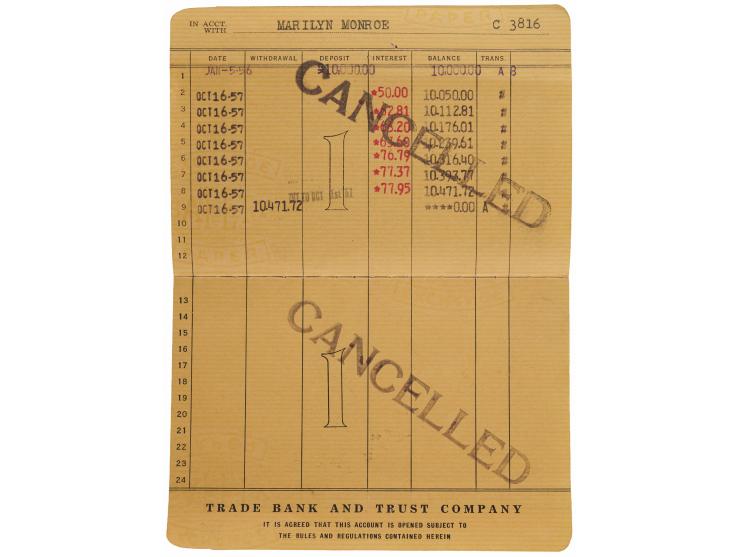 Marilyn Monroe’s savings account booklet from the Trade Bank and Trust Company of New York City, twelve pages, 3.5 x 5, with the first statement page identifying the account holder in type as “Marilyn Monroe,” with passbook serial number “C 3816,” a number also present on the front cover. Only the opening page contains account details, consisting of a deposit of $10,000 on January 5, 1956, and a withdrawal of the untouched deposit on October 16, 1957; with accrued interest, Monroe withdrew a total of $10,471.72. The first two pages are stamped twice “Cancelled.” In very fine condition.