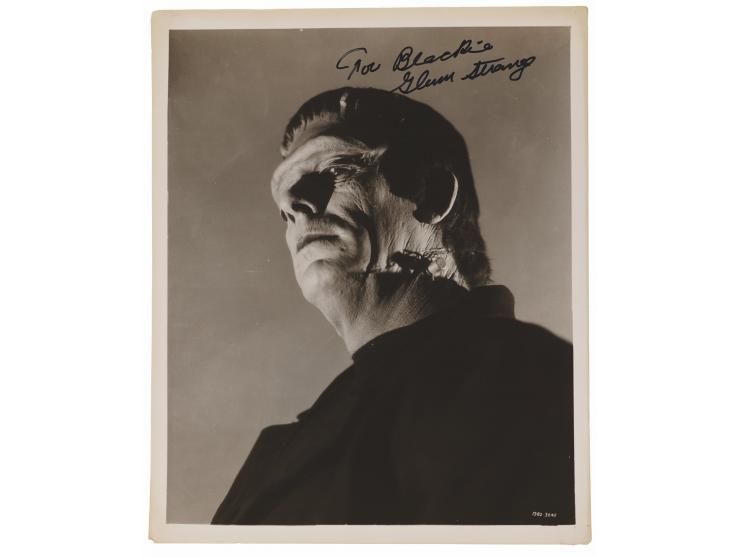 Vintage glossy 8.25 x 10 photo of Glenn Strange as Frankenstein’s Monster, signed and inscribed in black felt tip, “For Blackie, Glenn Strange.” In fine condition, with some light streaking to the emulsion.