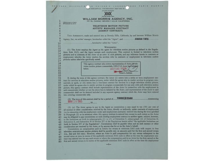 DS, seven pages, 8.5 x 11, March 10, 1965. Television Motion Picture Artist's Manager Contract between the William Morris Agency and Sharon Tate, who employs the former for a period of three years. Signed at the conclusion in black ink by Tate. In fine condition. A notable early contract marking Sharon Tate’s transition from small television roles into a professionally managed film career.