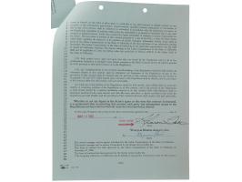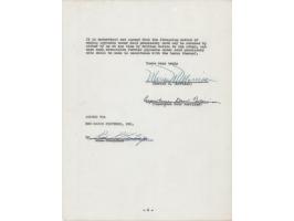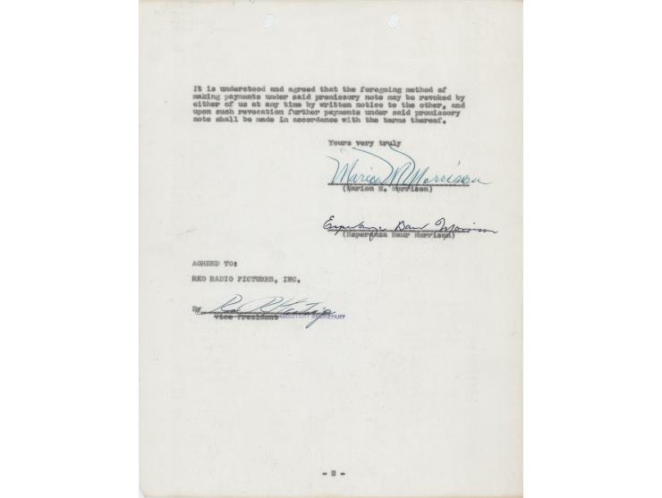 DS, signed "Marion M. Morrison," two pages, 8.5 x 11, January 5, 1951. Official letter from John Wayne to RKO Pictures concerning a promissory note in the amount of $120,000, which reads, in part, "You have waived, and hereby waive, interest on said promissory note for the period from December 13, 1950 to and including December 18, 1950…We have authorized and directed you…to deduct the sum of One Hundred Fifty Dollars…a week from the compensation of Mr. Morrison (John Wayne)." Signed at the conclusion in blue ballpoint by Wayne with his given name, and countersigned by his second wife, Esperanza Baur. In fine condition.
