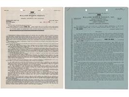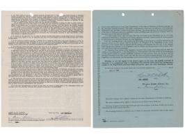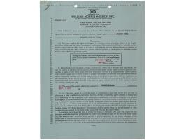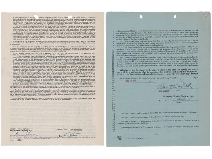Two DSs, individually signed by Bud Abbott and Lou Costello, both dated to May 14, 1956, including: a six-page Television Motion Picture Agency Contract between the William Morris Agency and Bud Abbott, who employs the former for three years; and a two-page contract between the William Morris Agency and Lou Costello, who also employs the former for three years. The comedians sign in ballpoint at the conclusion of their respective contracts. In overall fine condition.