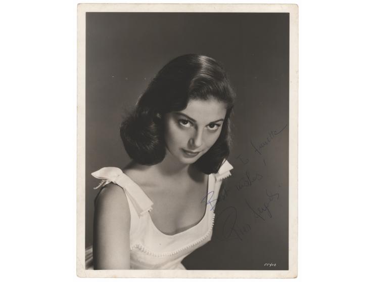Vintage matte-finish 8 x 10 photo of the beautiful actress in a bust-length pose, signed and inscribed in blue ballpoint, "To Annette, Best wishes! Pier Angeli.” In fine condition, with a couple small surface creases, and a very faint horizontal bend passing through her hair.