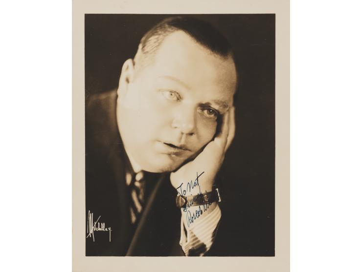 Vintage glossy 8 x 10 Mitchell Studio portrait photo of Roscoe 'Fatty' Arbuckle with an exasperated expression, signed and inscribed in fountain pen, "To Nat, Sincerely, Roscoe Arbuckle.” In very good to fine condition, with a couple of light diagonal creases across Arbuckle's tie.