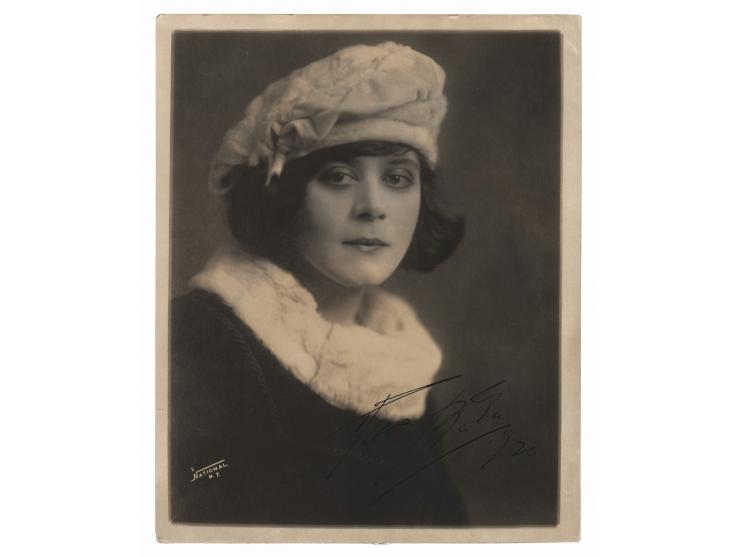 Vintage matte-finish 8 x 10 National Studios portrait photo of Bara in a head-and-shoulders pose, signed in fountain pen, "Theda Bara, 1920." In fine condition, with faint silvering to the darker areas of the image.