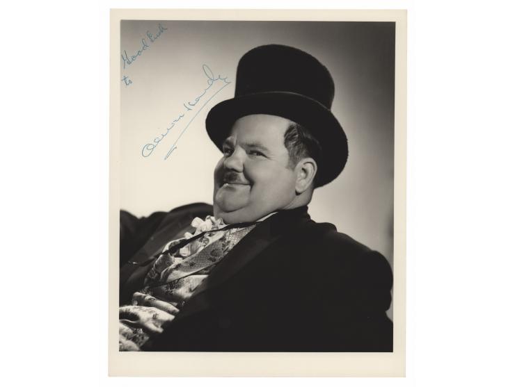 Vintage matte-finish 8 x 10 photo of the rotund comedian wearing a top hat and a mischievous smile, signed in blue ballpoint, "Good luck to, Oliver Hardy," who has left the inscription blank. In very fine condition. A crystal clear portrait of the legendary entertainer.