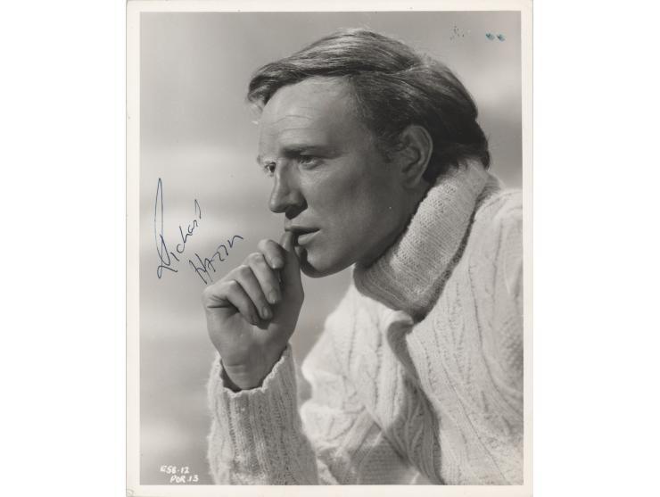 Crystal-clear vintage glossy 8 x 10 photo of Richard Harris in a knit turtleneck sweater, signed in fountain pen. In fine condition, with a few small blue stains in the upper right corner.