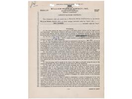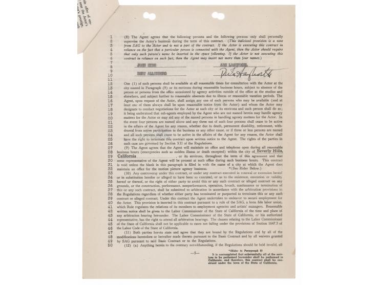 DS, six pages, 8.5 x 11, August 30, 1950. Artist's Manager Contract between the William Morris Agency and Rita Hayworth, who employs the former for one year. Signed on the fifth page in black ink by Hayworth. In fine condition.