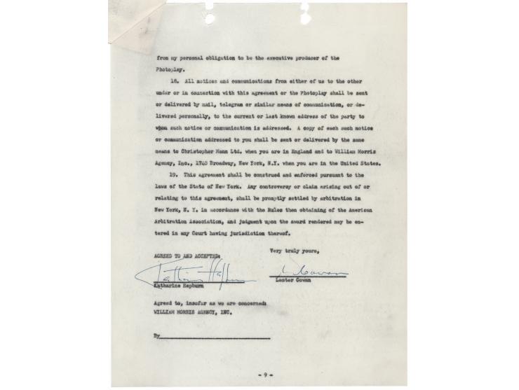 DS, nine pages, 8.5 x 11, November 6, 1953. Agreement between the William Morris Agency and Katharine Hepburn related to the “production of a photoplay…based upon ‘The Millionairess’ by George Bernard Shaw.” Signed at the conclusion in blue ballpoint by Hepburn. In fine condition. Written in 1936 by George Bernard Shaw, The Millionairess enjoyed a major revival in 1952 when Katharine Hepburn led a celebrated London production that later moved to New York for an 83-performance run. The play was adapted for film in 1960, directed by Anthony Asquith and featuring Sophia Loren alongside Peter Sellers.