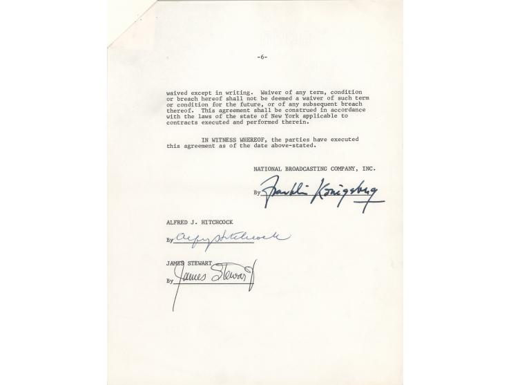 DS, signed "Alfred J. Hitchcock" and "James Stewart," six pages, 8.5 x 11, March 22, 1966. An agreement between Hitchcock, Stewart, and NBC regarding an “exclusive license to telecast on free television on a national network basis within the fifty states of the United States…the color motion picture entitled ‘The Man Who Knew Too Much.’ Signed at the conclusion in ballpoint by Hitchcock and Stewart, and countersigned by NBC representative Frank Konigsberg. In fine condition.