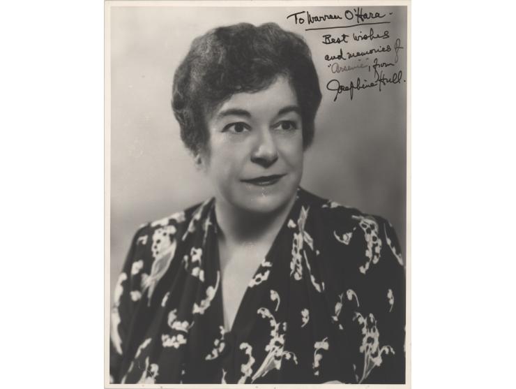 Vintage matte-finish 7.75 x 9.75 bust photo of the actress, signed and inscribed in fountain pen with a reference to Arsenic and Old Lace, "To Warren O'Hara—Best wishes and memories of 'Arsenic,' from Josephine Hull.” Reverse bears the credit stamp of NYC photographer Irving Chidnoff. In fine to very fine condition, with an unobtrusive repaired tear to the lower left corner.