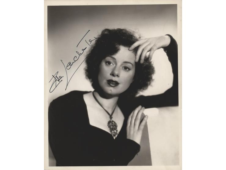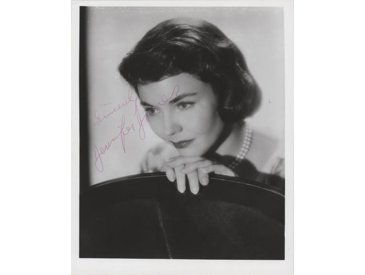 Vintage glossy 8 x 10 photo of Jones in a pensive pose, signed in red ballpoint, "Sincerely, Jennifer Jones." In fine condition.
