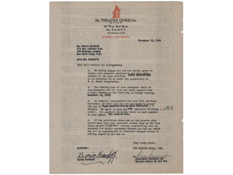 DS, one page, 8.5 x 11, November 27, 1950. Agreement between Boris Karloff and The Theatre Guild, Inc.'s Radio Division, in which he agrees to render services "to act in a radio version of the play entitled, David Copperfield,'" to be broadcast on Christmas Eve, for the sum of $825. Signed at the conclusion in fountain pen by Boris Karloff, and countersigned by an executive producer. In fine condition.