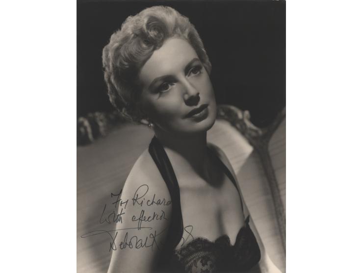 Vintage matte-finish 10 x 13 photo of Kerr in a lacy top, signed and inscribed in black felt tip, "For Richard, With affection, Deborah Kerr.” In fine condition, with light silvering along the extreme edges.