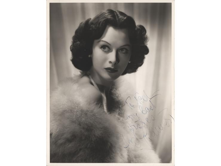Vintage matte-finish 10 x 13 photo of Lamarr draped in a dazzling boa, signed and inscribed in fountain pen, "To Neal—very best wishes—Hedy Lamarr.” In very fine condition, with one tiny trivial edge tear.