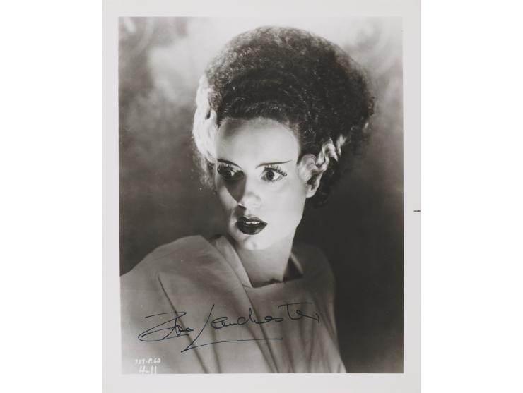 Glossy 8 x 10 photo of Elsa Lanchester in a seated, bust-length pose, signed in black felt tip. In fine condition, with a small crease, and some tiny surface impressions.