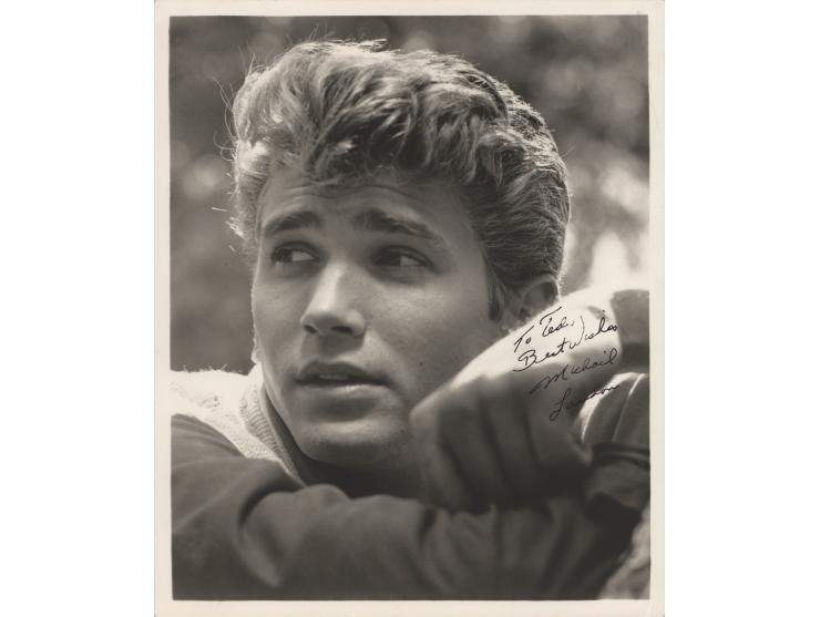 Vintage matte-finish 8 x 10 close-up photo of the youthful star, signed and inscribed in fountain pen, "To Ted, Best Wishes, Michael Landon.” In very fine condition.