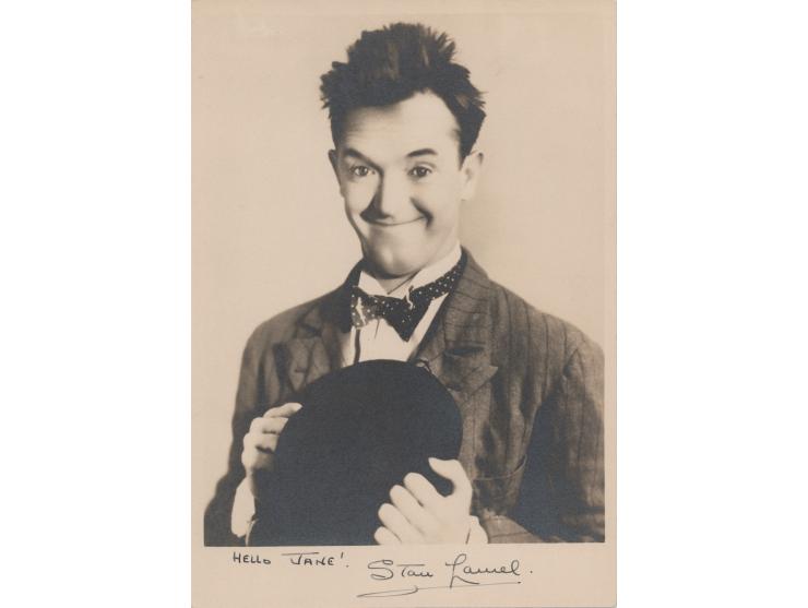 Vintage matte-finish 7 x 10 photo of Laurel smiling and holding his bowler hat, signed and inscribed in the. lower border in fountain pen, "Hello Jane! Stan Laurel.” Reverse bears a Stax credit stamp. In very good to fine condition, with a small repaired tear to the upper left corner background. Accompanied by a full letter of authenticity from JSA.