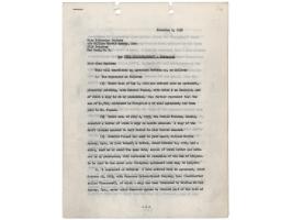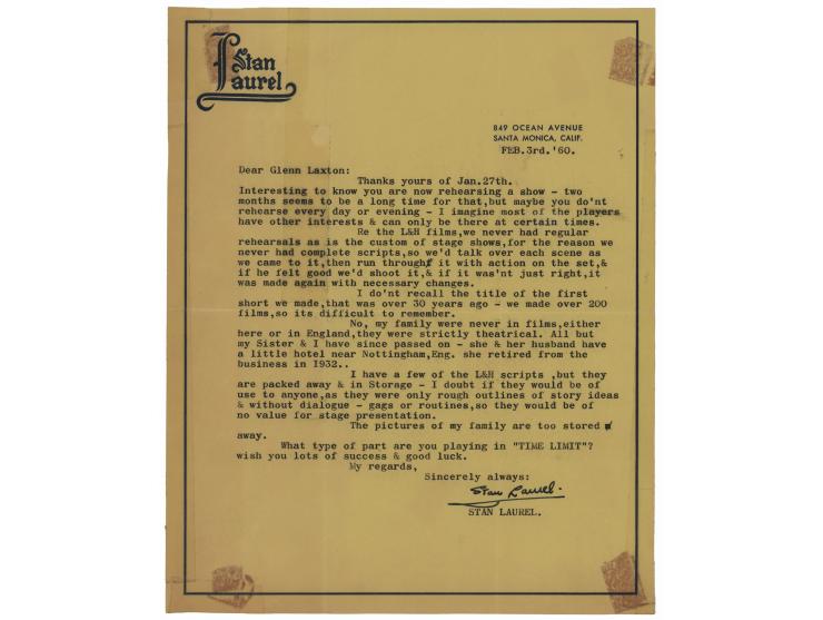 TLS, one page, 8 x 10, personal letterhead, February 3, 1960. Letter to Glenn Laxton, in part: "Interesting to know you are rehearsing a show—two months seems to be a long time for that, but maybe you don't rehearse every day…Re the L&H films, we never had regular rehearsals as is the custom of stage shows, for the reason we never had complete scripts, so we'd talk over each scene as we came to it, then run through it with action on the set, & if he felt good we'd shoot it, & if it wasn't just right, it was made again with necessary changes. I don't recall the title of the first short we made, that was over 30 years ago—we made over 200 films, so it's difficult to remember…I have a few of the L&H scripts, but they are packed away & in storage—I doubt if they would be of use to anyone, as they were only rough outlines of story ideas & without dialogue—gags or routines, so they would be of no value for stage presentation." In very good to fine condition, with old tape stains at the corners, and a clear piece of tape over portions of the first two paragraphs. Accompanied by the original mailing envelope.
