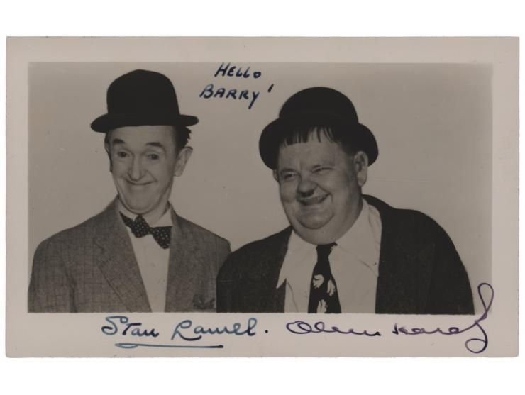 Vintage glossy 5.5 x 3.5 photo of the classic comedic duo side-by-side in their bowler hats, signed and inscribed in fountain pen, "Hello Barry! Stan Laurel" and "Oliver Hardy.” In very good to fine condition, with two small surface dents, and some light postal impressions.