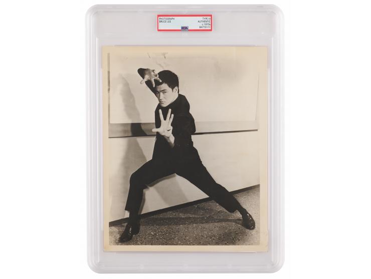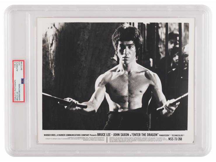 Original vintage glossy 10 x 8 Warner Bros. publicity photo for the classic 1973 martial arts film Enter the Dragon, picturing lead star Bruce Lee ready for combat in a powerful half-length pose. The reverse bears stamps and labels from Movie Still Archives. In fine condition. Encapsulated by PSA as an authentic 'Type III' photograph dated to 1973. This image, and his work in films like The Big Boss and Enter the Dragon, helped popularize martial arts films in the 1970s and promoted Hong Kong action cinema globally.
