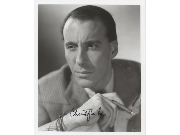Glossy 8 x 10 photo of Christopher Lee smoking a cigar, signed in black felt tip. In very fine condition.