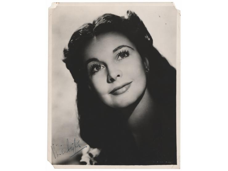 Vintage glossy 7.75 x 9.75 photo of Vivien Leigh in her iconic role of Scarlett O'Hara from the classic film Gone With the Wind, signed in fountain pen. In very good to fine condition, with small creases, surface impressions over her face visible at an angle, and corner loss which could be matted out if desired.