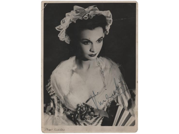 Vintage semi-glossy 4.5 x 6.25 promotional photo of Vivien Leigh as Lady Teazle in a production of the play The School for Scandal in 1948, signed in fountain pen. The name of photographer John Vickers is inherent to the bottom of the image. In very good to fine condition, with light scuffing, small corner creases, and a crease touching Leigh's hair. Power couple Laurence Olivier and Vivien Leigh played Sir Peter and Lady Teazle in a production of the play at the New Theatre as part of the Old Vic Company. The production also starred Peter Cushing and Terence Morgan.