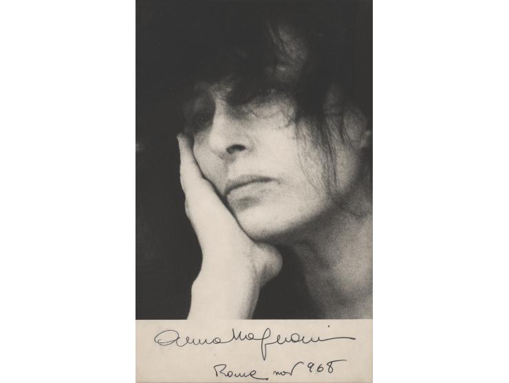 Vintage matte-finish 5.75 x 9.5 close-up photo of the Italian actress, signed in the lower border in black ink, "Anna Magnani, Rome, nov 968." In fine condition.