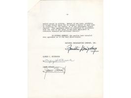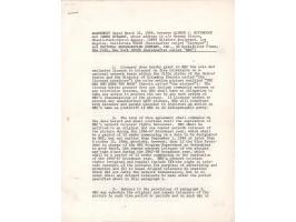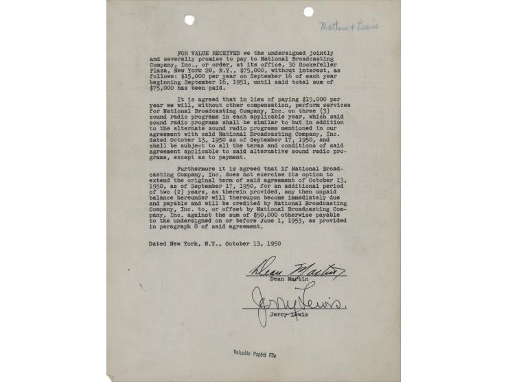 DS, one page, 8.5 x 11, October 13, 1950. Dean Martin and Jerry Lewis agree to repay a $75,000 advance from NBC, in part: "It is agreed that in lieu of paying $15,000 per year we will, without other compensation, perform services for National Broadcasting Company, Inc., on three (3) sound radio programs in each applicable year." Signed at the conclusion in fountain pen by Dean Martin and Jerry Lewis. In fine condition.