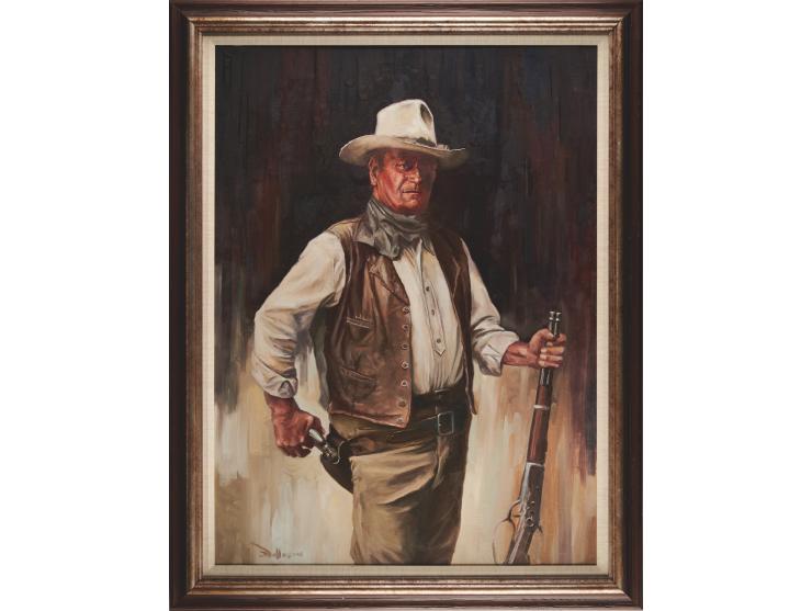 Large portrait painting of John Wayne by an unknown artist, accomplished in oil on a 27.75 x 38.5 canvas, depicting ‘Duke’ in a classic three-quarter-length Western pose with one hand gripping the barrel of a rifle and his other resting on the grip of a holstered pistol. The painting is signed in the lower left corner by the artist, ostensibly “D. Jefferson.” The handsome portrait serves as a faithful painted reproduction of a famous photograph by Bob Willoughby, taken in 1971 at the Warner Bros. studio on the set of the Western film The Cowboys, which starred Wayne in the lead role as Wil Andersen, a tough, aging Montana rancher and cattleman who must drive a large herd of cattle to market. When his regular cowhands abandon him for a nearby gold rush, he’s forced to hire a group of schoolboys as inexperienced cowhands to make the drive. Willoughby’s photo later ran on the cover of LIFE magazine in 1972, with the headline ‘John Wayne: Memories of a G-rated Cowboy.’ Framed sans glass to an overall size of 35 x 45.25. In fine condition.