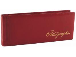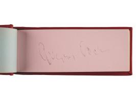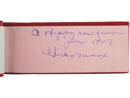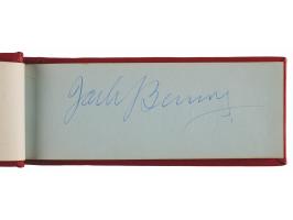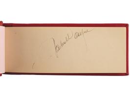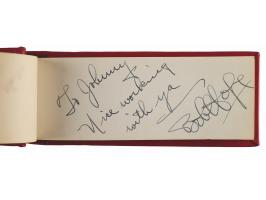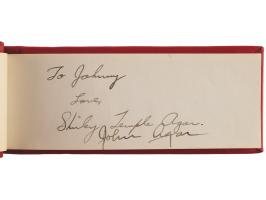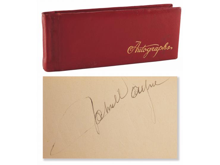 Vintage circa late 1940s hardcover autograph album, 6 x 2.5, signed inside in fountain pen by 25 entertainers, many with inscriptions to "Johnny." Includes: John Wayne, Chico Marx, Gregory Peck, Hoagy Carmichael, Jack Benny, Paul Winchell, Eddie Peabody, Martha Raye, Shirley Temple, John Agar, Dorothy Lamour, Peggy Mann, Robert Armstrong, Forrest Tucker, Harry Carey, Jr., Pat O'Brien, Rudy Vallée, Bob Hope, and a few others. In fine condition.