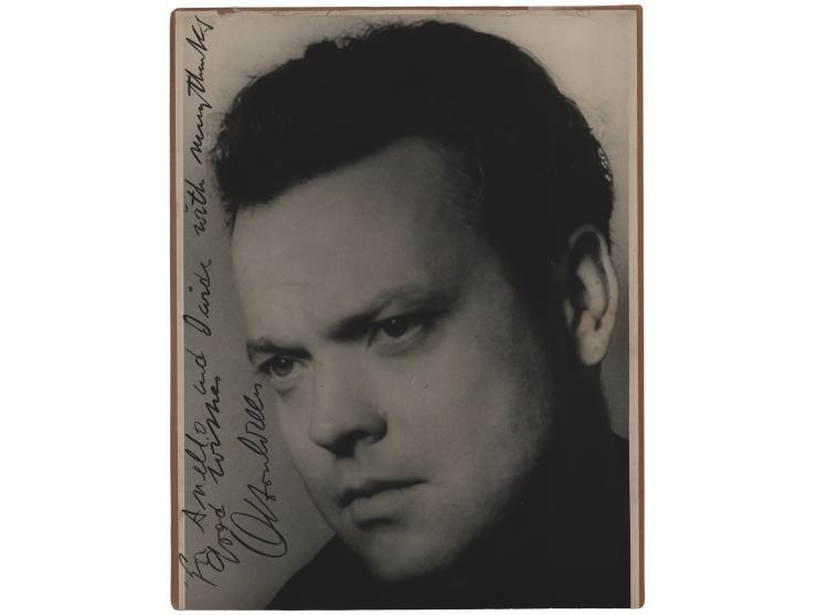 Vintage glossy 7 x 9 close-up photo of the celebrated actor and filmmaker, signed and inscribed in fountain pen, "For Anello…with many thanks, Good wishes, Orson Welles.” Affixed to a cardstock mount and in very good to fine condition, with small surface creases and impressions, and trivial loss to the top edge.