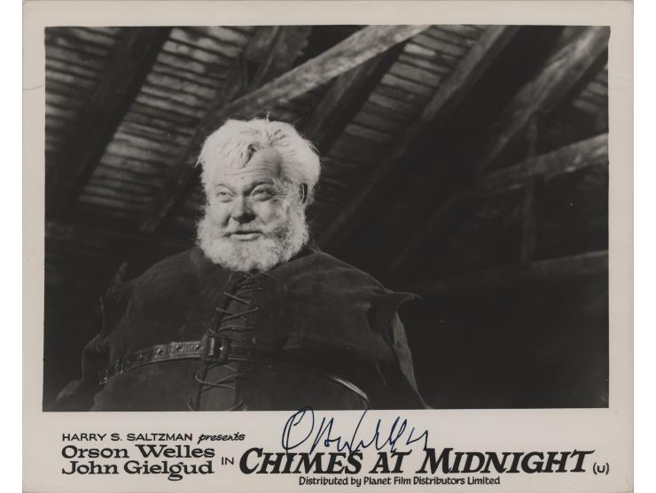 Vintage glossy 10 x 8 publicity photo of Orson Welles as Sir John Falstaff in the 1966 Shakespeare-inspired film Chimes at Midnight, signed in fountain pen. In fine condition, with some small creases and a tiny edge tear.