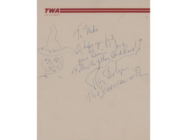 Original ballpoint sketch of the Scarecrow of Oz accomplished by Ray Bolger on an off-white 7.25 x 9 sheet of TWA letterhead, signed and inscribed in blue ballpoint, "To Mike, I hope you find your Brain! Just follow the Yellow Brick Road. Ray Bolger, The Scarecrow of Oz." In very fine condition. The previous owner notes that Bolger drew this for Mike Mina, who was a first class steward for TWA; it was obtained in 1979, while Bolger was on a flight from Los Angeles to New York.