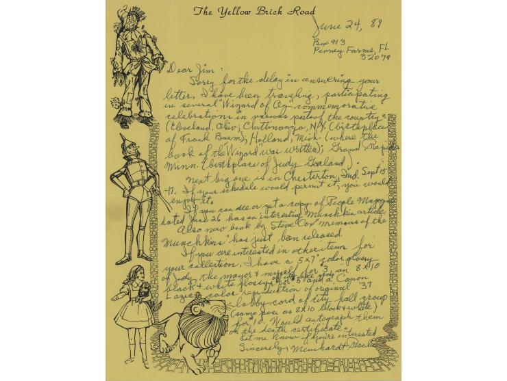 ALS, one page, 8.5 x 11, illustrated Wizard of Oz letterhead, June 24, 1989. Handwritten letter to an admirer, in part: "Sorry for the delay in answering your letter. I have been traveling, participating in several 'Wizard of Oz' conventions in various parts of the country: Cleveland, Ohio; Chittinango, N.Y. (birthplace of Frank Baum); Holland, Mich. (where the book of the 'Wizard' was written); Grand Rapids, Minn. (birthplace of Judy Garland). Next big one is in Chesterton, Ind., Sept. 15–15. If your schedule would permit it, you would enjoy it." In fine condition.
