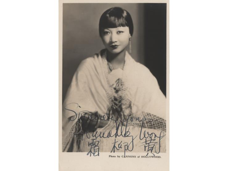 Vintage matte-finish 3.5 x 5.25 postcard photo of the pioneering Chinese-American actress in a lovely half-length pose, signed in fountain pen in English and Chinese, "Sincerely yours, Anna May Wong." In fine condition.
