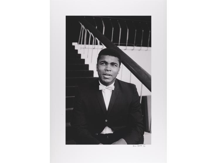 Beautiful limited edition 22.25 x 31 museum-quality archival pigment print of Muhammad Ali, numbered 1/25, depicting the young boxer seated on a staircase in a formal half-length pose, an image originally taken by photographer Brian Hamill, who has signed the lower border in black ink. In very fine condition.