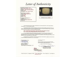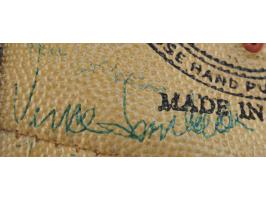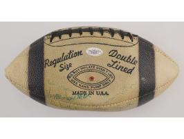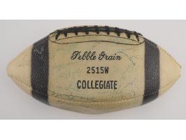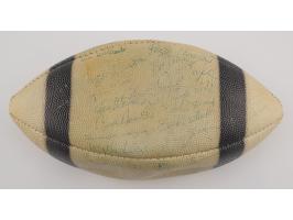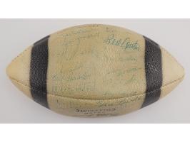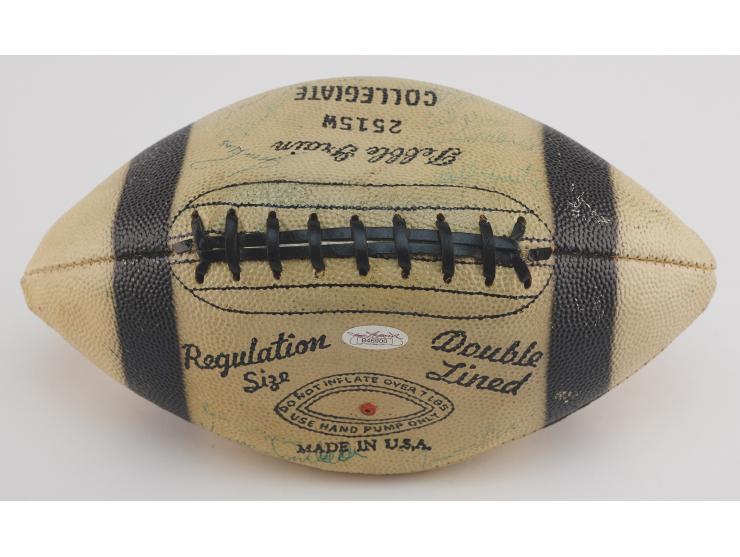White Collegiate "Pebble Grain" football with black laces, signed in blue ballpoint by Vince Lombardi and 40 members of his 1963 Green Bay Packers football team, including: Tom Fears, Jim Taylor, Willie Davis, Henry Jordan, Willie Wood, Bart Starr, Jim Ringo, Ray Nitschke, Herb Adderley, Fuzzy Thurston, Boyd Dowler, Max McGee, Elijah Pitts, and others. In very good to fine condition, with most of the signatures faded or very light; Lombardi's signature is the bold exception. Accompanied by a full letter of authenticity from JSA.
